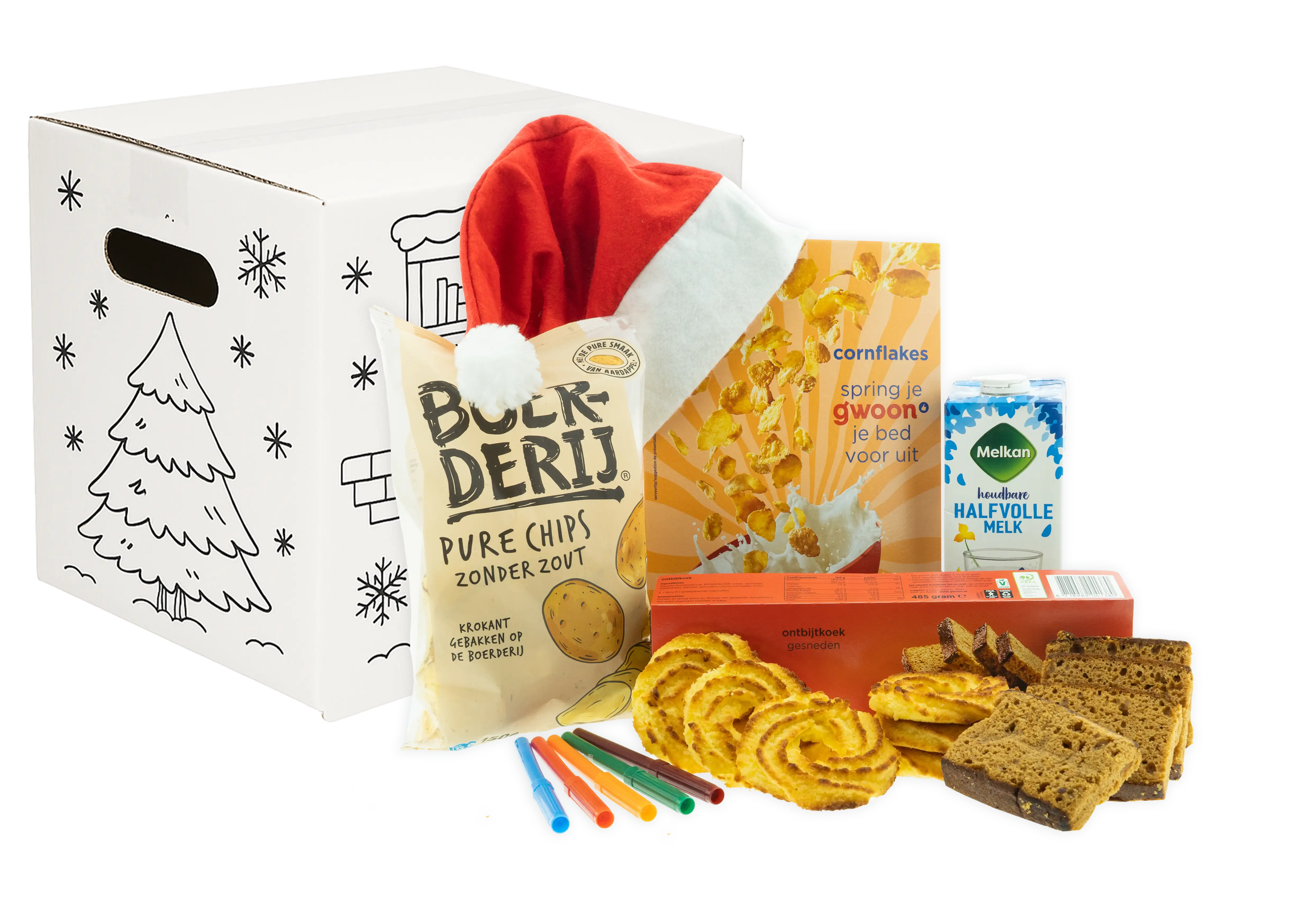 Dit pakket bevat 7 producten met o.a. Stiften, een kerstmuts, kokoskrans, melk, cornflakes, ontbijtkoek en groente-chips.